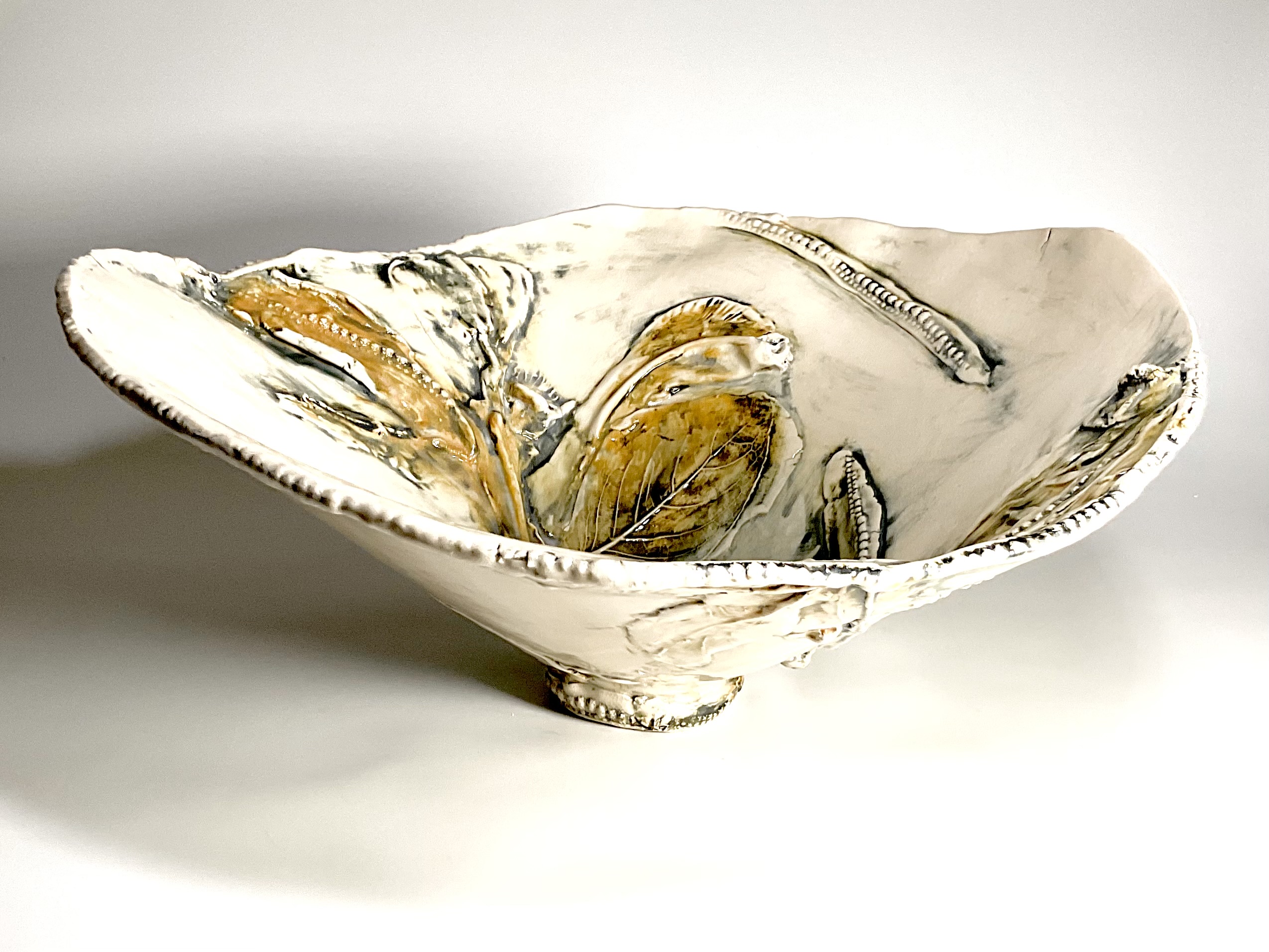 Hand built ceramic sculpture using botanical molds to create the surface. Stained and fired in a sawdust kiln.