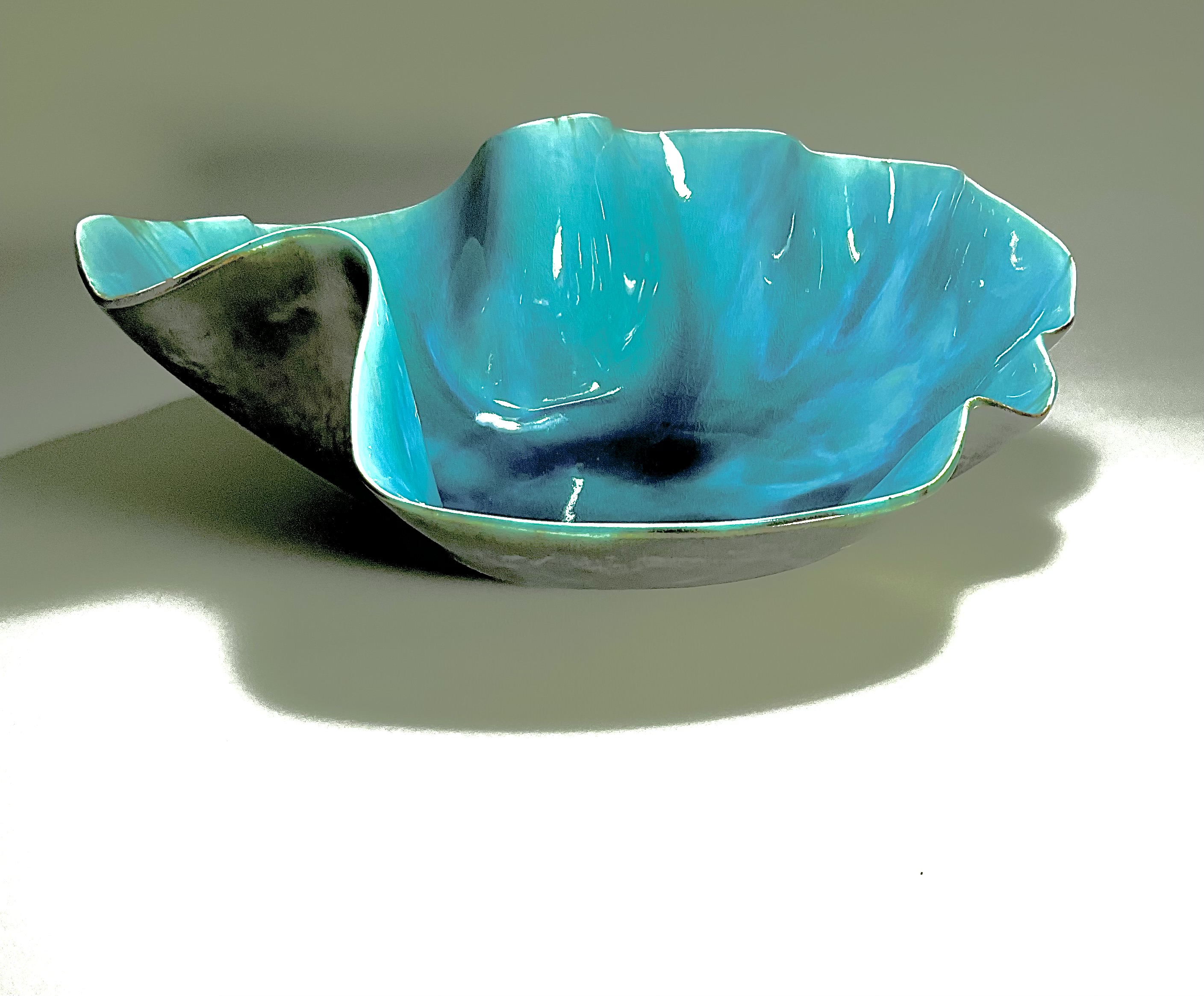 Handbuilt and glazed with Metallic glaze. Not food safe.
